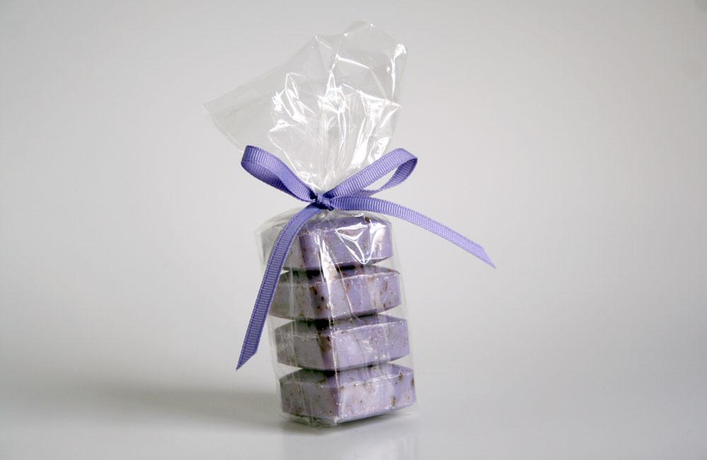 Four lavender guest soaps, wrapped and ready for giving. The same wonderful soap as the bath bars - fragrant and long-lasting and speckled with lavender flowers. With lavender essential oil and shea butter. Each soap weighs 25 grams. Origin: France